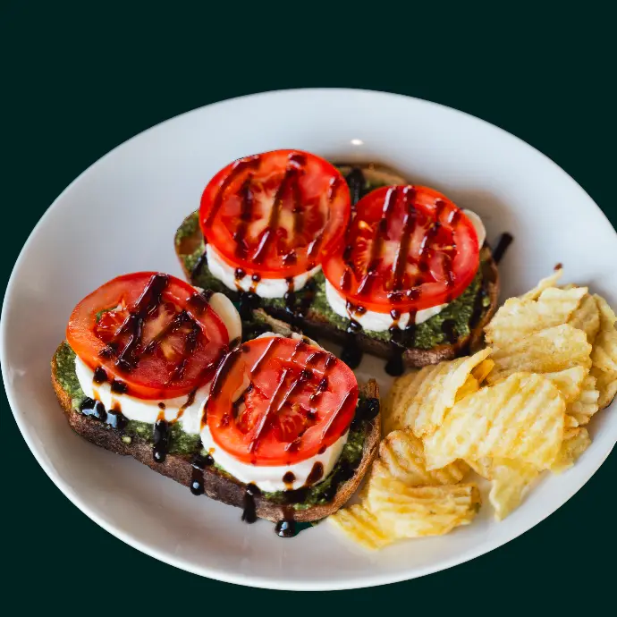 Toasted sourdough topped with pesto, fresh tomato, mozzarella, and a balsamic drizzle. (Served with a side of chips or simple greens.) (Sub cup of soup +$2)